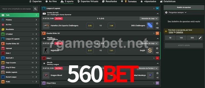 O 560Bet oferece uma grande seleção de opções de apostas em e-sports com probabilidades competitivas